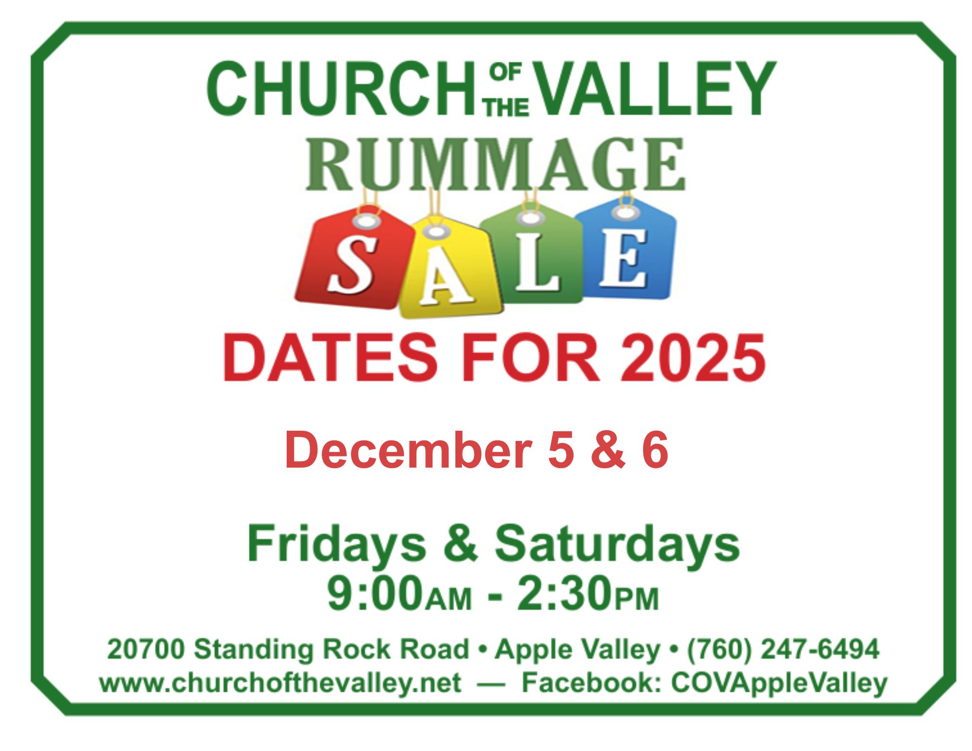 Sales are typically the 1st Friday and Saturday of the month every 4 months. Looking for fun or something specific, come see us before you look anywhere else! We offer prayer and promote events that are coming up at COV in the community. We have a wide variety of items for sale from $3 bags of clothes, shoes, holiday decorations, medical equipment, furniture, books, baby items, and household items.