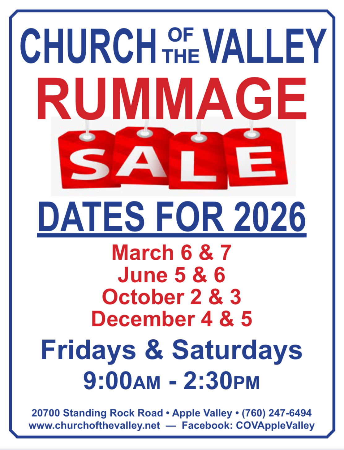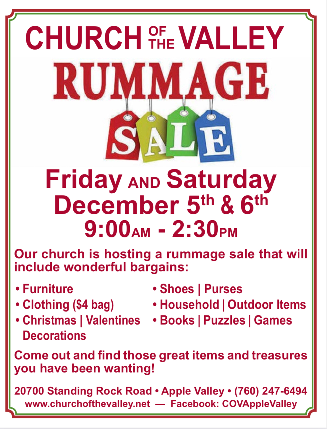 The money from these Rummage Sales goes to a variety of non-profit organizations such as God’s Ranch, God’s Extended Hand, and ministries within Church of the Valley. We sell things at a low and reasonable price with the intent to help the community get what they need. We love our community and pray for you at in our Rummage Ministry.